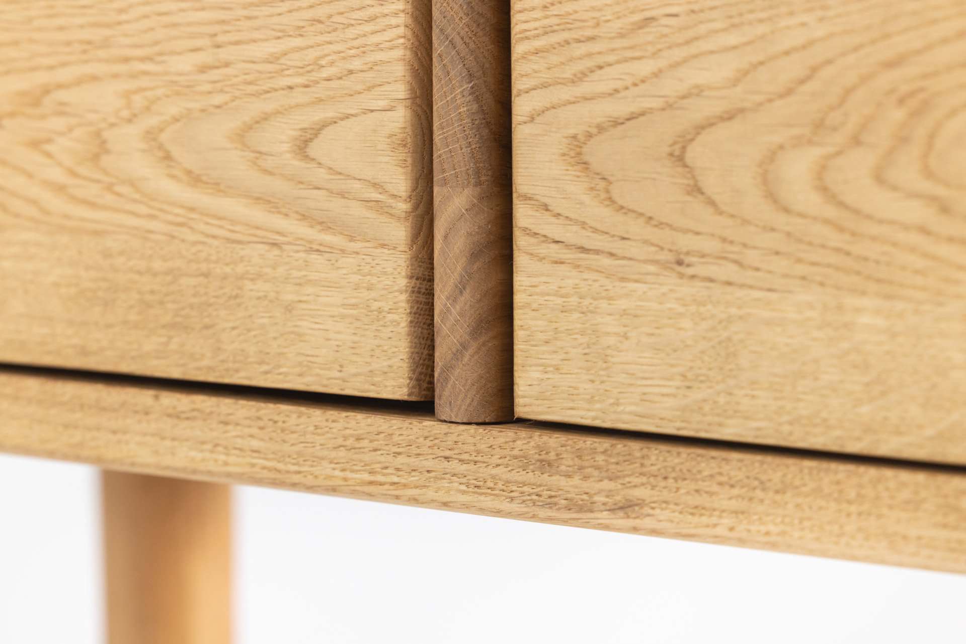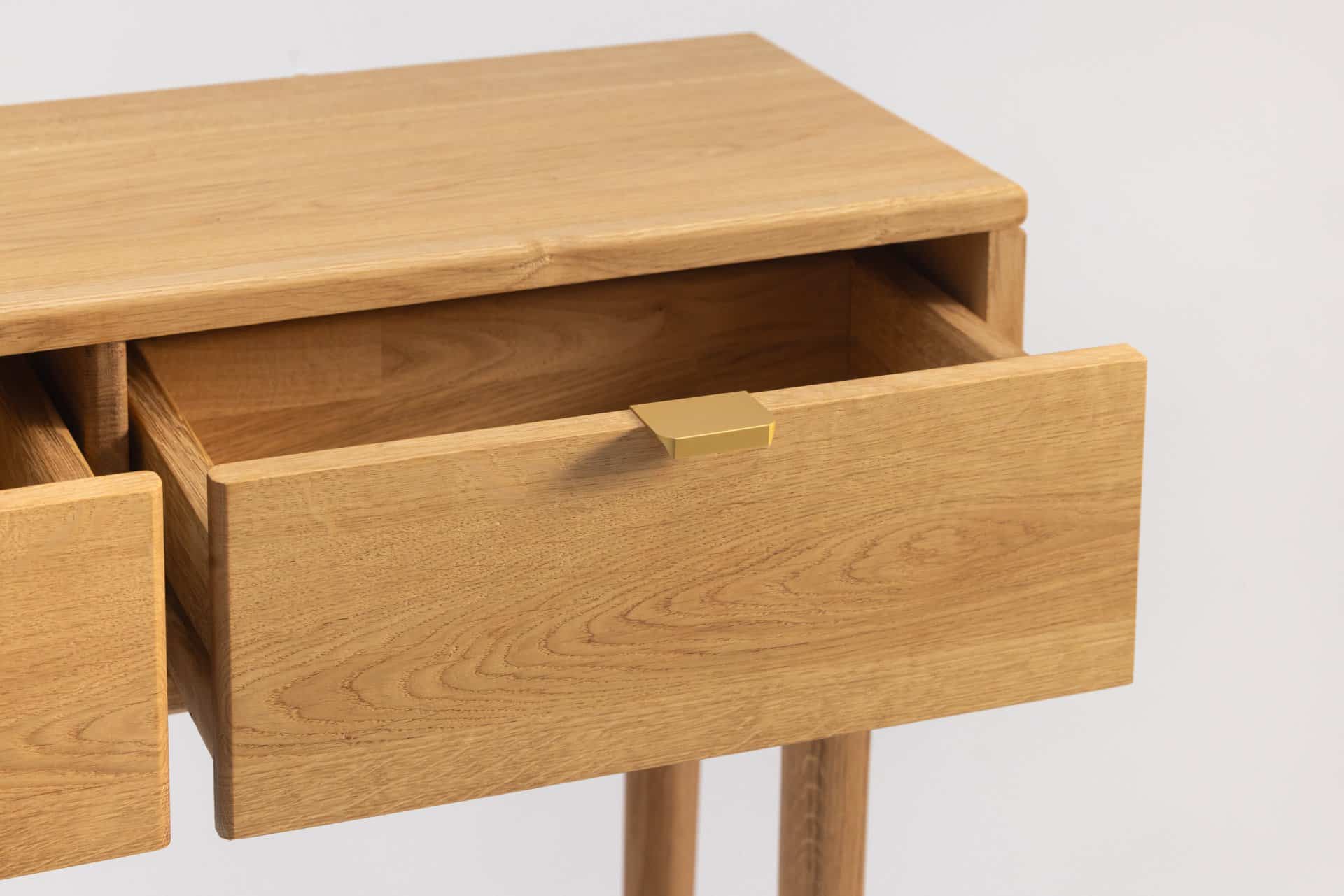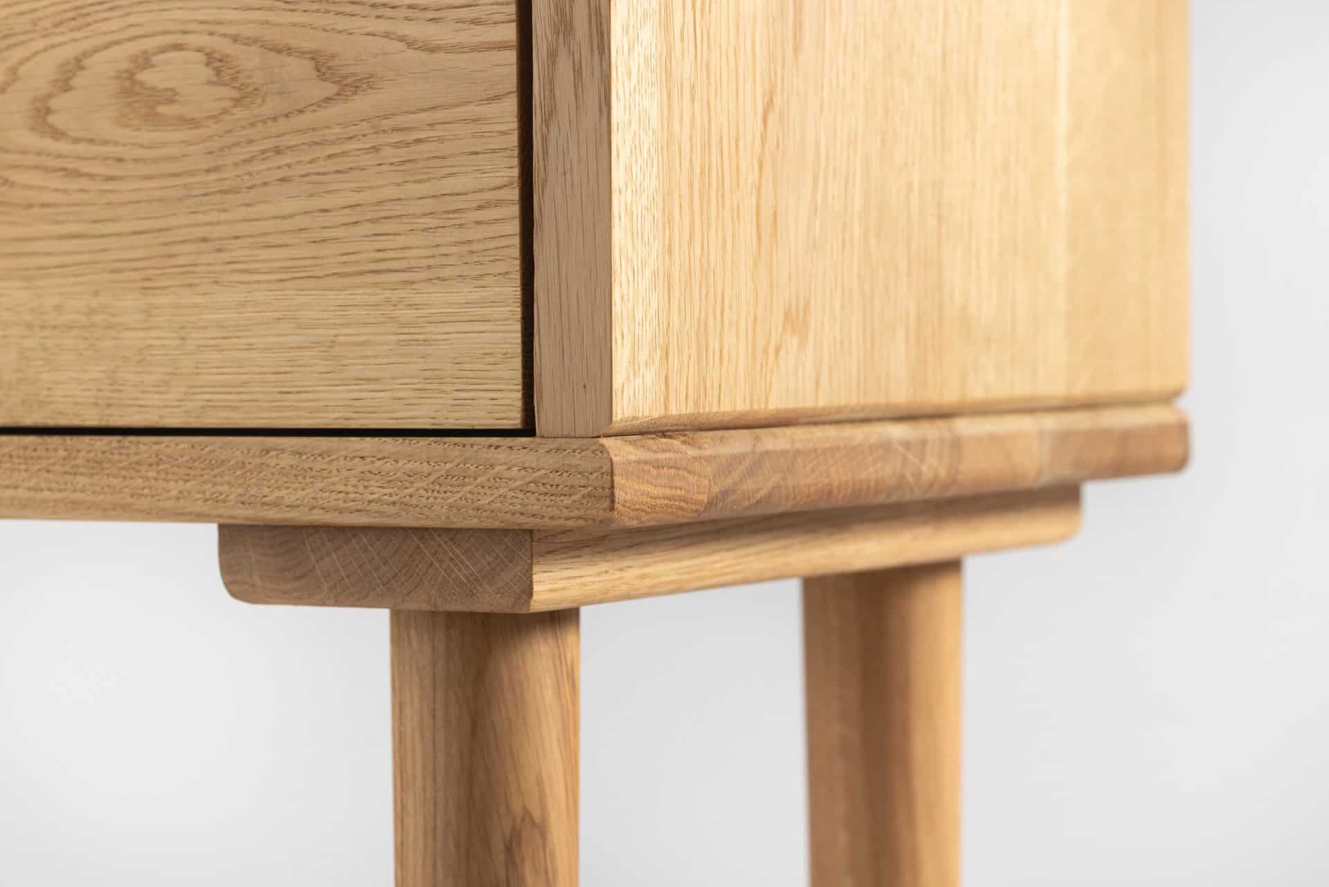 Stożkowe, toczone nogi z ozdobnymi maskownicami w miejscu łączenia nóg z korpusem tworzą elegancką podstawę. Fronty dwóch szuflad są zlicowane z bryłą, a całość wygląda jak wyrzeźbiona z jednego kawałka. Dolna półka, subtelnie zespolona z nogami od wewnątrz, nadaje konstrukcji lekkości. Wybrane krawędzie wykończone delikatnym frezem zaokrąglającym, łagodzą bryłę i nadają całości miękkości.